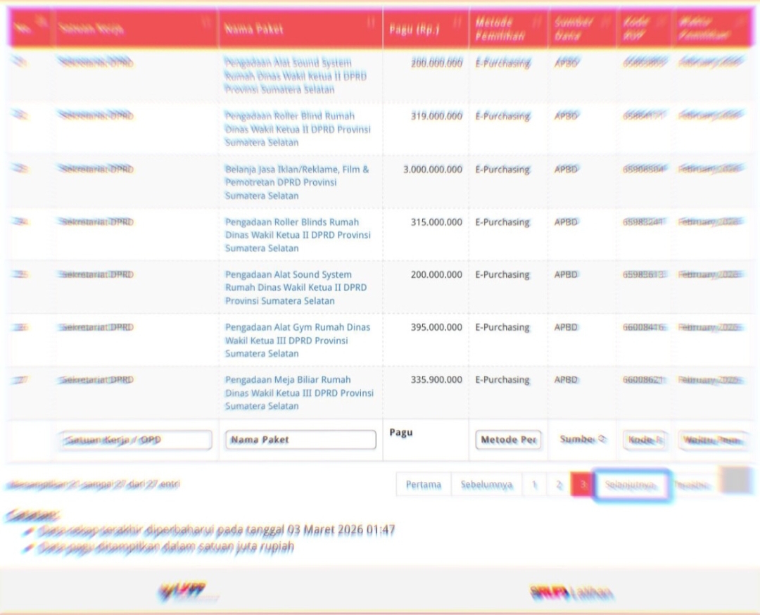 Berdasarkan data yang diperbarui per 7 Maret 2026, alokasi anggaran untuk pengadaan tersebut mencapai sekitar Rp486,9 juta. Rinciannya, Rp151 juta untuk rumah dinas Ketua DPRD Sumsel dan Rp335,9 juta untuk rumah dinas Wakil Ketua III DPRD Sumsel.