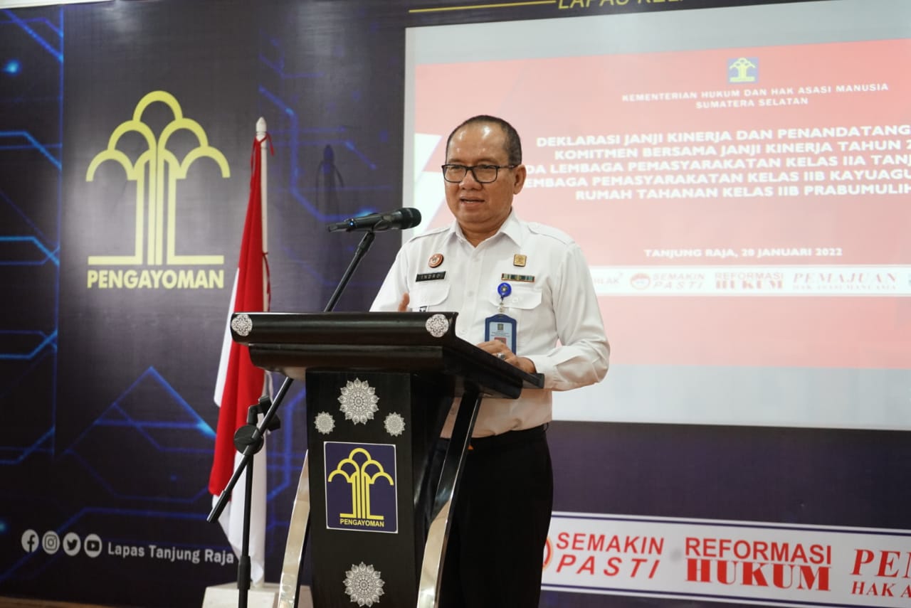 Pada kesempatan tersebut, Kepala Lapas Kelas IIA Tanjung Raja, Batara Hutasoit selaku tuan rumah menyampaikan laporannya. “Deklarasi janji kinerja ini adalah langkah awal meningkatkan komitmen, landasan dan pedoman pegawai dalam melaksanakan tugas dan meningkatkan integritas, loyalitas, kinerja serta pelayanan. Kami optimis di tahun 2022 ini mampu berkontribusi bagi Kanwil Kemenkumham Sumsel untuk menjadi satuan kerja yang berpredikat WBK/WBBM,” ujar Kalapas.