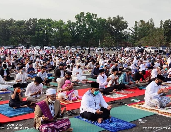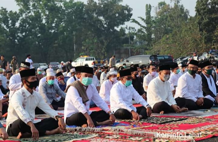 Pelaksanaan sholat idul Adha yang berlangsung di tengah-tengah Pandemi virus covid19 yang berlangsung di halaman Seganti Setungguan eks (MTQ) Lahat di ikuti oleh unsur SKPD Pemkab Lahat,serta warga sekitar.