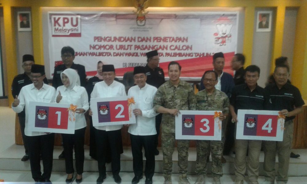 Dan inilah nomer urut Paslon Pilwakot Palembang 2018-2023, nomor urut 1 (Harnojoyo-Fitrianti Agustinda). Nomor urut 2 (Sarimuda-Abdul Rozak). Nomor urut 3 (Akbar Alfaro-Hernoe Roespridajadi) dan nomor urut 4 adalah Mularis-Syaidina Ali.