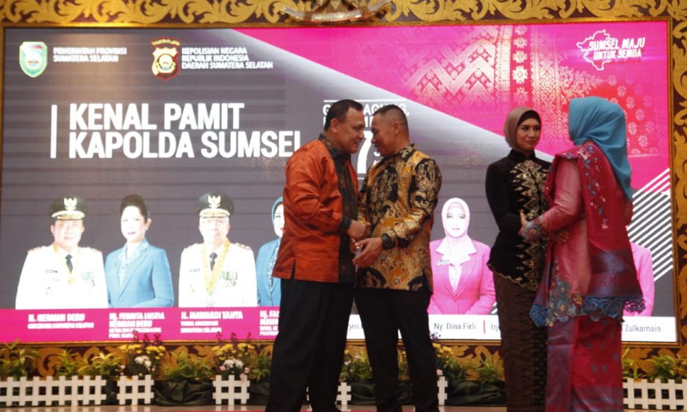 PALEMBANG,Sumseltoday.com – Gubernur Sumatera Selatan (Sumsel) H.Herman Deru menghadiri malam Kenal Pamit Kapolda Sumsel, di Griya Agung (27/06). Saat ini, Pemimpin tertinggi Polda Sumsel adalah oleh Irjen Pol. Drs Firli, M.Si, sebelumnya Ia menjabat sebagai Deputi Penindakan Komisi Pemberantasan Korupsi (KPK). Sementara Kapolda Sumsel yang lama Irjen Pol. Drs. Zulkarnain Adinegara kini resmi menjabat sebagai Kakorpolairud Baharkam Mabes Polri.