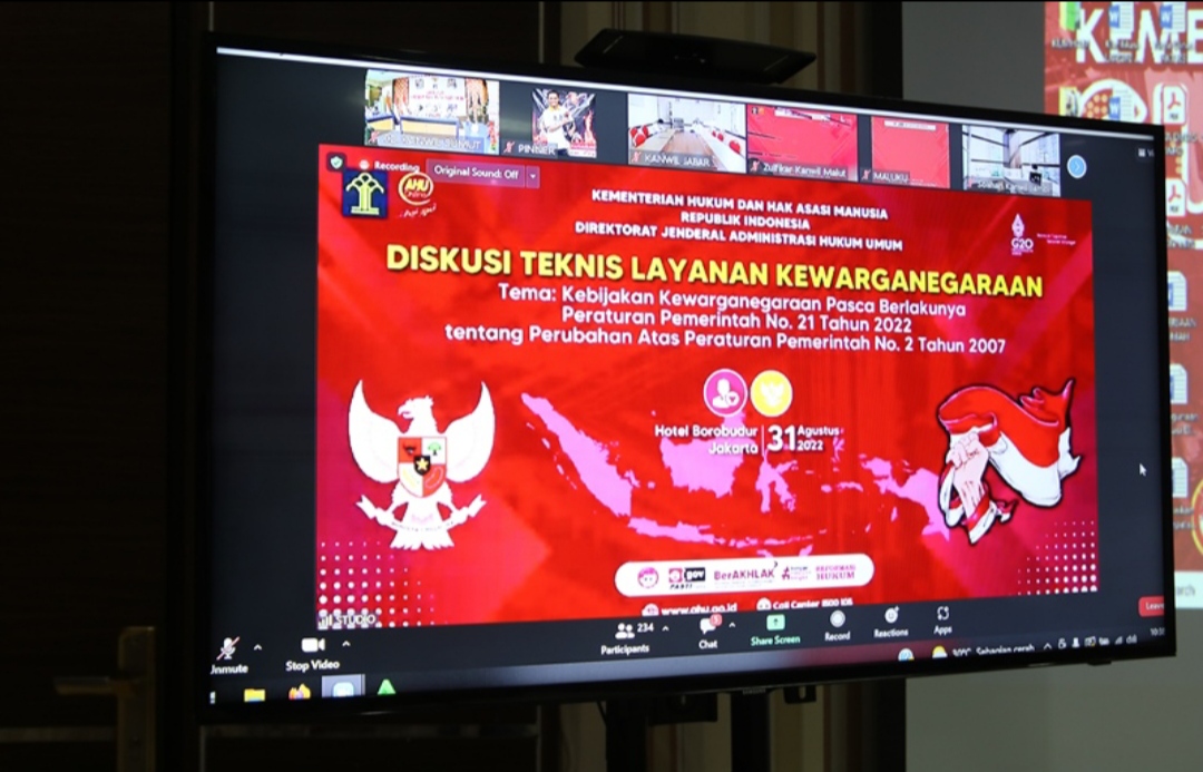 Palembang. Kepala Divisi Pelayanan Hukum dan HAM (Kadivyankumham) Kanwil Kemenkumham Sumsel, Parsaoran Simaibang minggu (4/9 ) mengatakan bahwa pihaknya melalui Sub Bidang Administrasi Hukum Umum telah mengikuti secara virtual Diskusi Kebijakan Kewarganegaraan Pasca Berlakunya PP Nomor 21 tahun 2022. Rabu (31/8) kemarin.