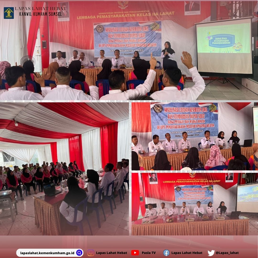 Sosialisasi yang dihadiri oleh Kepala Lapas Kelas IIA Lahat, Imam Purwanto, serta pejabat struktural lainnya. Kasubid Yantah, PKR Divisi Pemasyarakatan Kanwil Kemenkumham Sumatera Selatan, memberikan materi mengenai standarisasi dapur sehat. Sementara itu, Ibu Widwi, Psikolog Klinik Kanwil Kemenkumham Sumatera Selatan, menjelaskan pentingnya kesehatan jiwa.