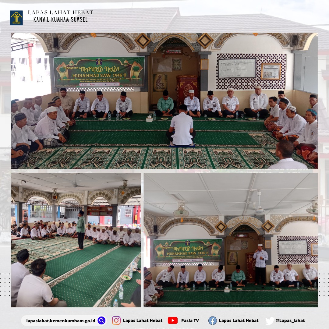 Lahat – Dalam rangka memperingati Maulid Nabi Muhammad SAW, Lembaga Pemasyarakatan Kelas IIA Lahat mengadakan acara peringatan dengan tema yang sangat relevan, yakni “Ketauladanan Nabi Muhammad SAW Sebagai Pembinaan Diri bagi Warga Binaan Pemasyarakatan”. Rabu, 18 September 2024. bertempat di masjid At Taubah Lapas Lahat.