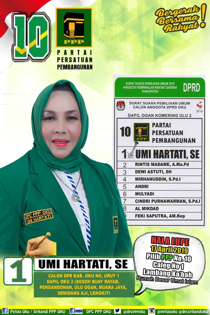 Maka itulah Umi Hartati.Se mencalonkan diri DPRD Kab.OKU 2, partai persatuan pembangunan (PPP) optimis terus berjuang demi merealisasikan pembangunan, untuk masyarakat kabupaten OKU yang ia cintai. Adapun Visi dan Misi Umi Hartati.se bila terpilih nanti, pada Pemilu 17 April 2019, Hala Lupe Pilih Partai persatuan pembangunan (PPP) nomor 10, caleg Nomor 1 lambang Ka,bah Rumah besar umat islam. Ungkapnya umi Hartati.se