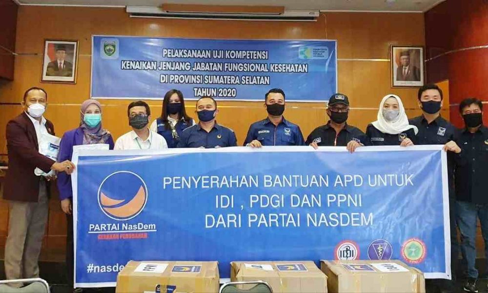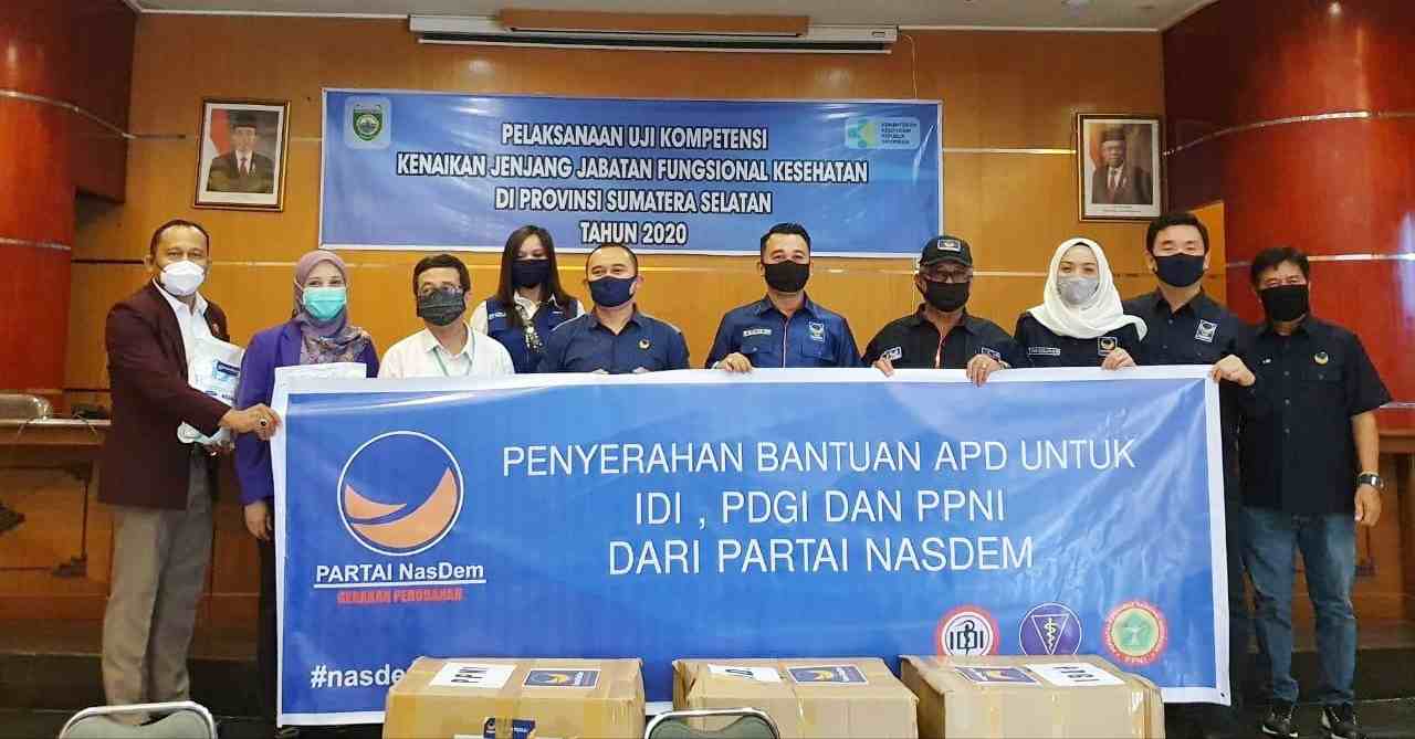 Penyerahan APD dari DPW Partai Nasdem Sumsel diberikan masing-masing untuk tiga organisasi profesi yaitu Ikatan Dokter Indonesia (IDI) Sumsel, Persatuan Dokter Gigi Indonesia (PDGI) Sumsel serta Persatuan Perawat Nasional Indonesia (PPNI) Sumsel.