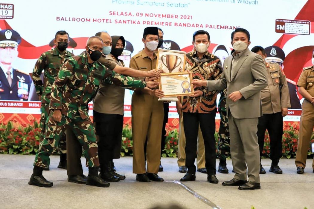 Penghargaan ini diserahkan Gubernur Sumsel Herman Deru dan diterima langsung oleh Wali Kota Palembang Harnojoyo, di acara Rapat Koordinasi Forum Koordinasi Pimpinan Daerah (Forkopimda) Provinsi Sumatera Selatan dan Kabupaten Kota se- Sumatera Selatan Tahun 2021, di Ballroom Hotel Santika Premiere, Palembang, Selasa (9/11/2021).