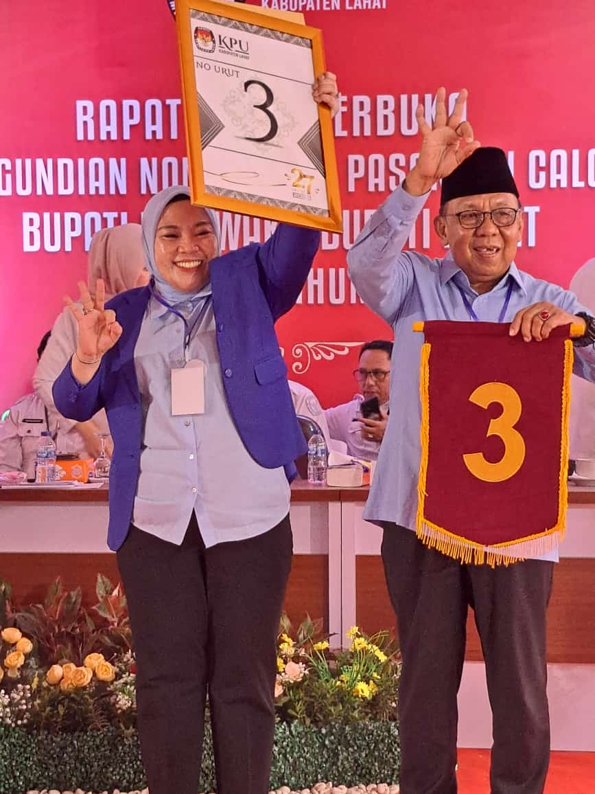 LAHAT.ST.- Paslon Bupati-Wakil Bupati Lahat periode 2024-2029, Hj Lidyawati Cik Ujang SHut MM-H Haryanto SE MM MBA alias (Berlian), resmi mendapatkan nomor urut 3, di kontestasi Pemilihan Kepala Daerah (Pilkada) Lahat 2024, Bagi Lidyawati-Haryanto, nomor urut 3, punya nilai history sendiri yang memang diharapkan.