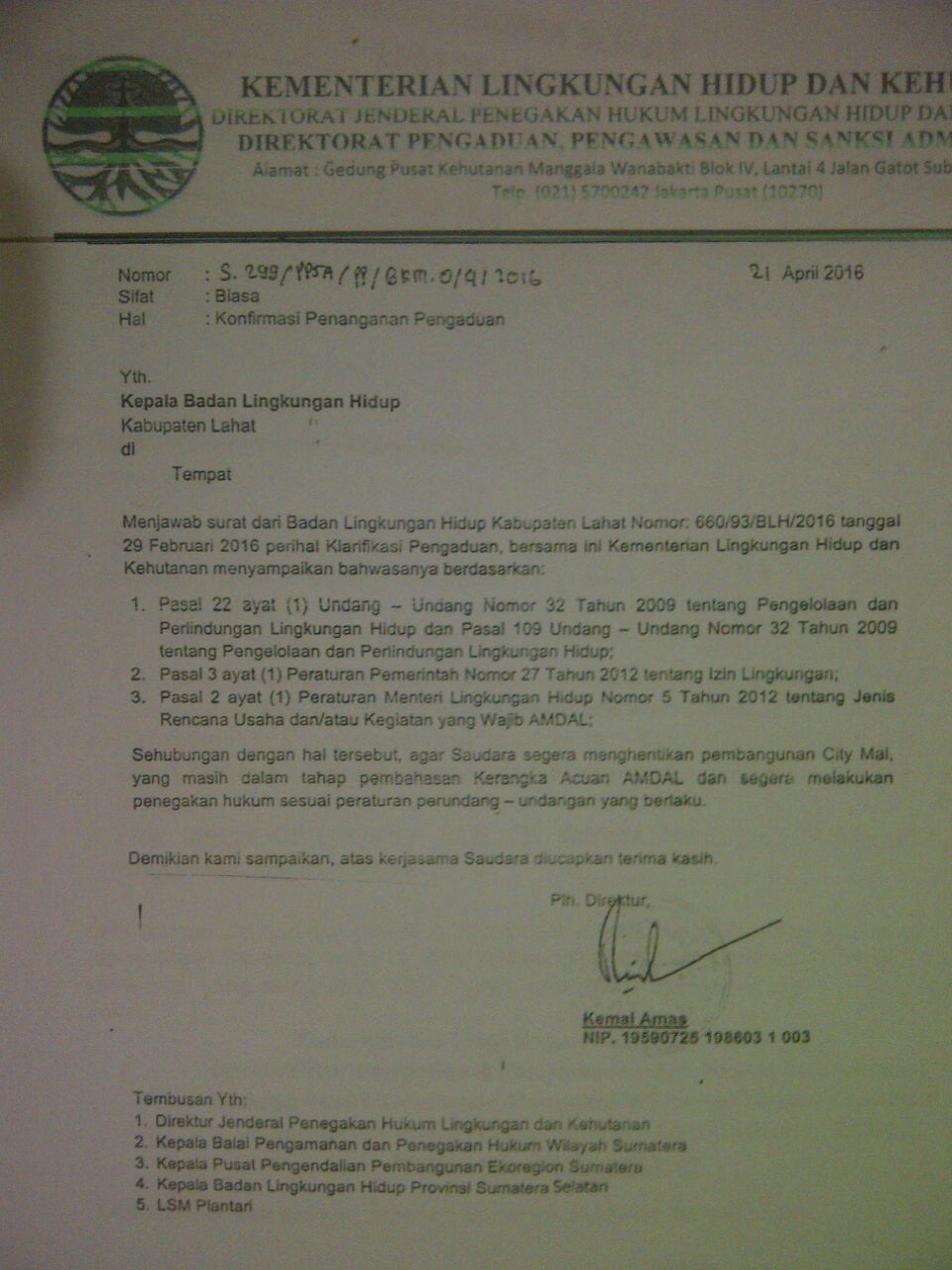Rencananya, pekan ini LSM Plantari akan melengkapi laporkan kasus City Mall ke Polda Sumatera Selatan terdahulu (03 Februari 2016) terkait telah keluarnya surat dari Kementerian Lingkungan Hidup dan Kehutanan Direktorat Pengaduan, Pengawasan dan Sanksi Adminitrasi No. S 299/PPSA/PP/GKM.O/4/2016 tanggal 21 April 2016 agar BLH Lahat menghentikan Pembangunan City Mall dan segera melakukan Penegakan Hukum sesuai peraturan Perundangan yang berlaku.(Snd)