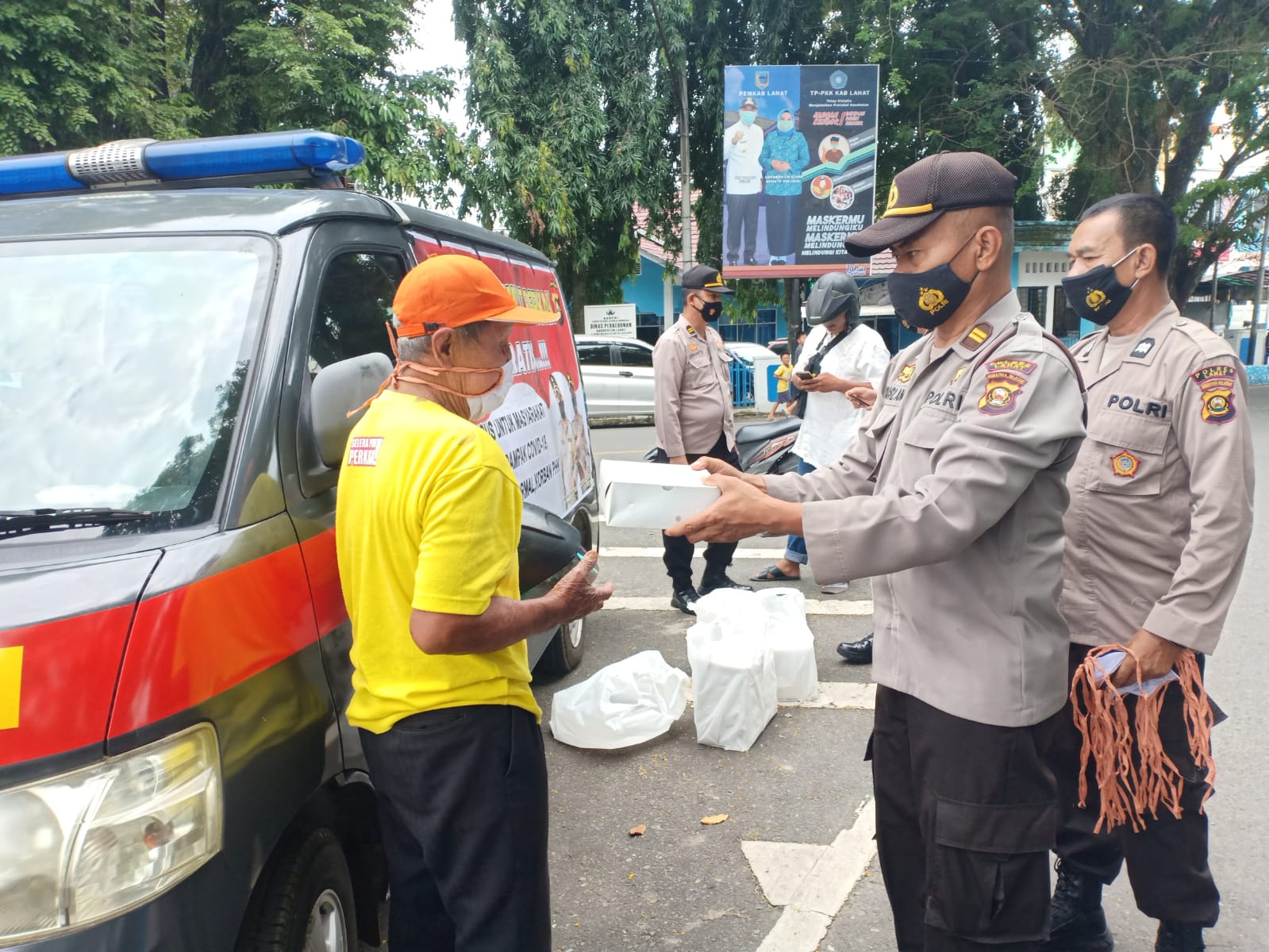 ” Ada Dua sesi pembagian nasi kotak, pertama pada pukul 10. 00 WIB sebanyak 50 nasi kotak telah dibagikan kepada para pengendara disekitaran simpang kodim Lama kelurahan pasar Lama Lahat yang dipimpin oleh KBO binmas Iptu Yuslan didampingi kasi Humas Iptu Sugianto dan sesi kedua setelah Salat Jum’at sebanyak 50 nasi kota diberikan ke Jamaah Masjid Al – Iklas Pasar Lama yang dipimpin oleh Kasat Intel AKP Maulana, SH” terang Kapolres Lahat AKBP Achmad Gusti Hartono, SIK melalui Paur Humas Aiptu Lispono.