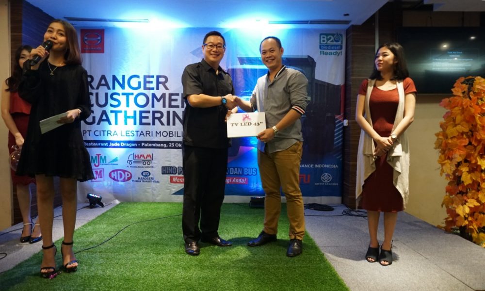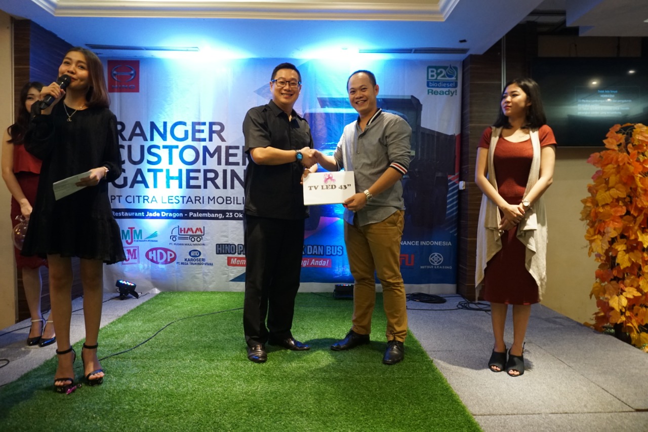 Palembang, Sumseltoday.com – Sebagai bentuk terima kasih kepada para customer pemilik Ranger HINO, PT Citra Lestari Mobilindo main dealer HINO mengadakan customer gathering. Acara ini bertujuan untuk mengenalkan produk dan mempererat keakraban dengan konsumen sembari menikmati santap malam dan hiburan beserta doorprize yang berlangsung di restoran Jade Dragon, Selasa (23/10/2018) malam.