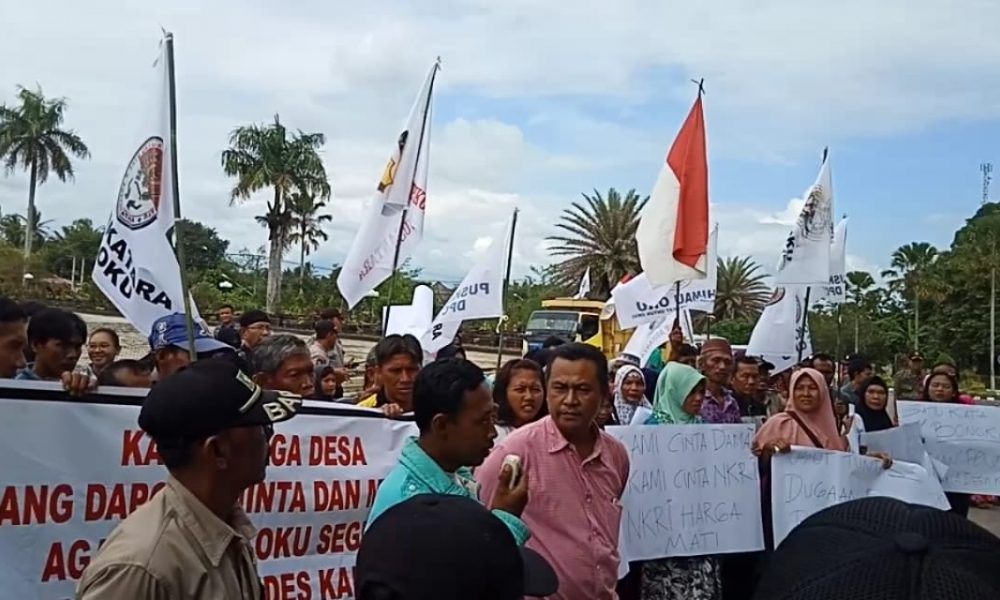 Baturaja, Sumseltoday.com – Ratusan Warga Desa Karang Dapo.Kecamatan Peninjauan, kabupaten Ogan Komering Ulu (OKU) Melakukan Aksi Demo ke halaman kantor Pemerintah kabupaten Ogan Komering Ulu (OKU) di Jalan A. Yani Kelurahan kemelak Bindung Langit pada Hari jumat 22/02/2019 pada Pukul 10 wib.