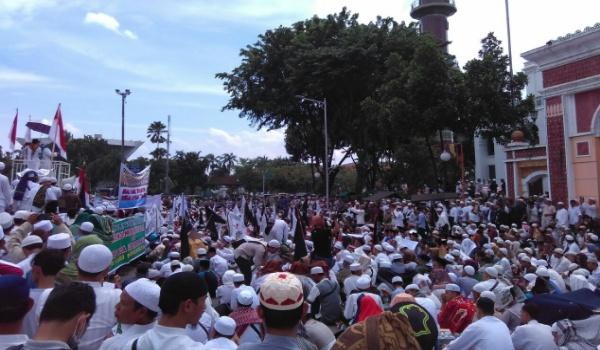 Aksi damai yang digelar usai sholat Jumat ini bertujuan menolak kriminalisasi terhadap para ulama.