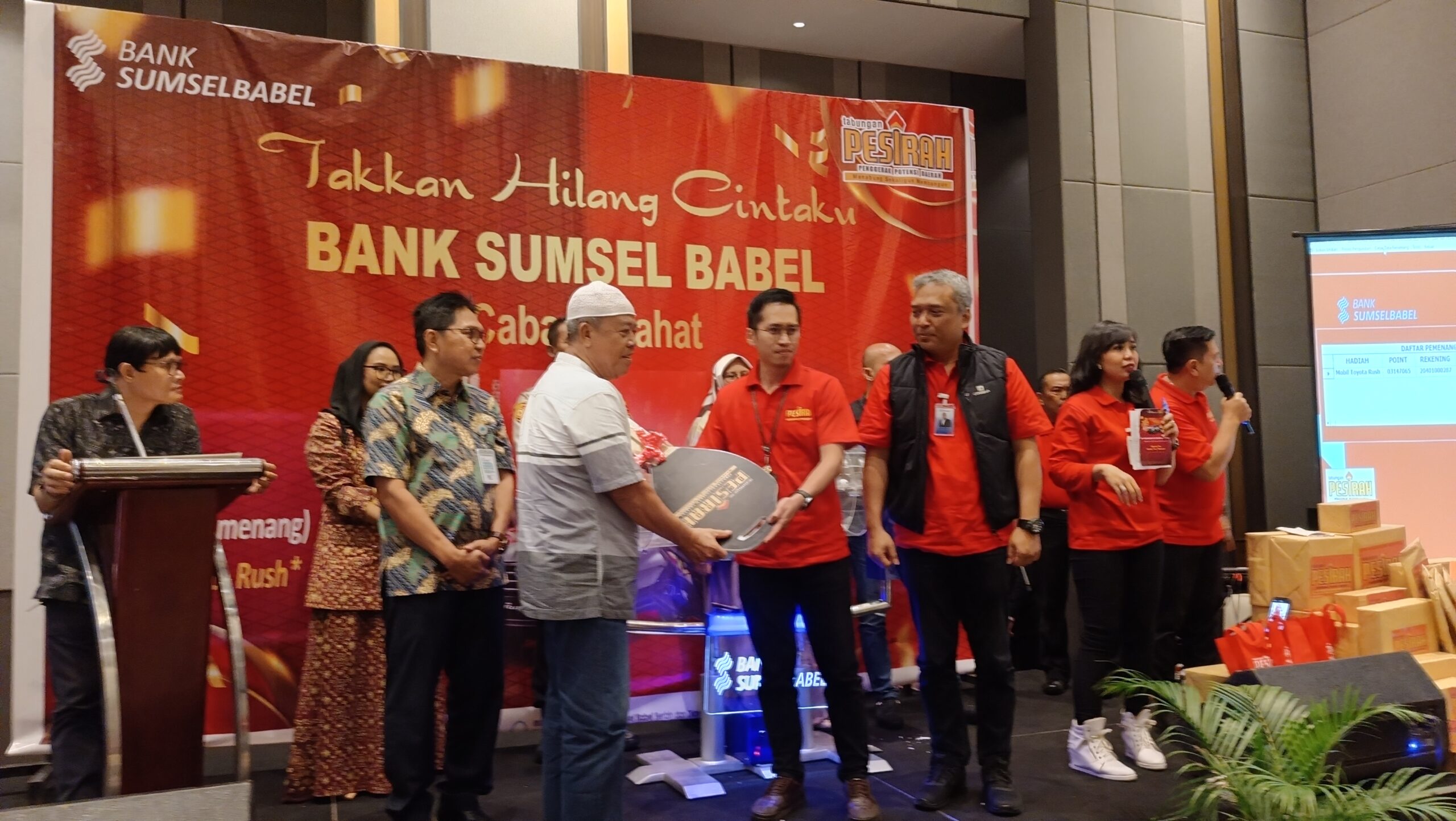 LAHAT.ST. – Kamis Tanggal 20-02-2024 Bank Sumsel Babel (BSB) Cabang Lahat Gelar Penarikan Undian Grand Prize Tabungan Pesirah Tahun Anggaran 2024 Mengusung Tema “Takkan Hilang Cintaku Bank Sumsel Babel” Yang Diselenggarakan Di Ball Room Hotel Santika Lahat, Agung Saputra Salah Satu Nasabah Yang Beruntung Meraih Grand Prize Hadiah Satu Unit Mobil Toyota Rush