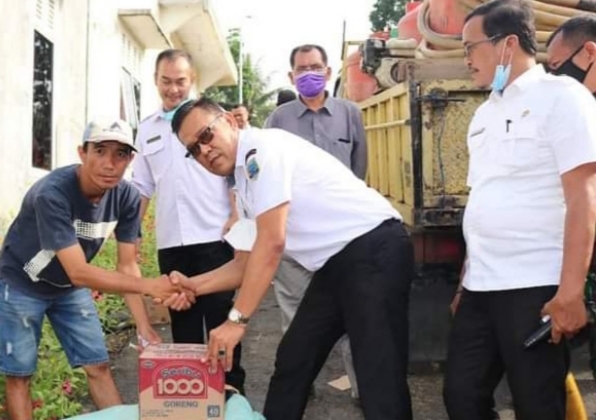 Sekda Lahat Chandra SH.MM berikan Bantuan Kemasyarakat yang terdampak Banjir, di Dusun IV Desa Sukarami, Kecamatan Gumay Talang, Kabupaten Lahat, Provinsi Sumatera Selatan