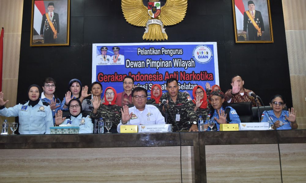 PALEMBANG,Sumseltoday.com, – Sekda Sumsel H. Nasrun Umar menghadiri pelantikan pengurus Gerakan Indonesia Anti Narkotika (GIAN) didampingi Ketua Umum DPP GIAN Guntur Eko Widodo serta Sekjen DPP GIAN Retno Ningsih Susilowati, di Auditorium Bina Praja, Rabu(10/7).