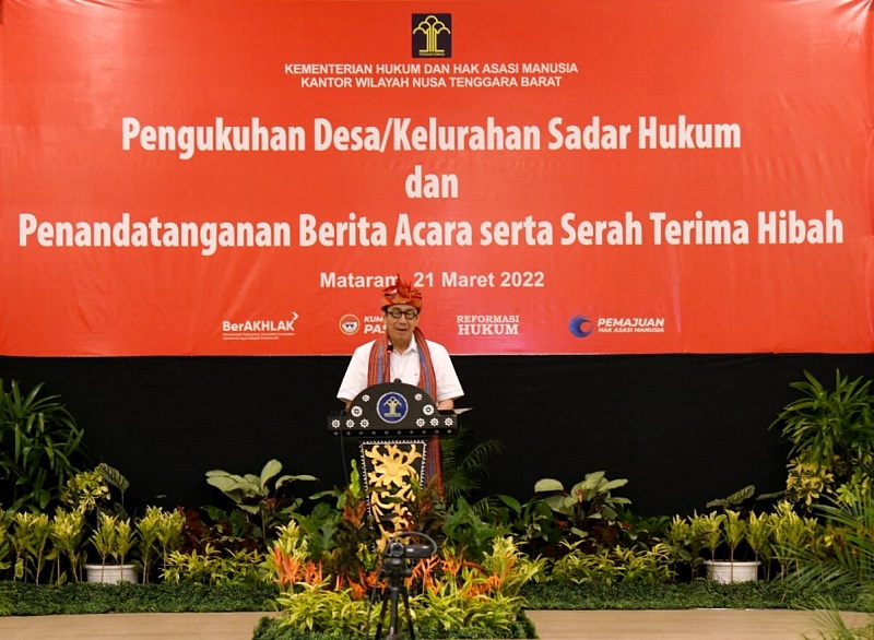Mataram, Sumseltoday.co – Tingkat kesadaran hukum yang tinggi di suatu daerah berdampak positif dan menjadi modal dasar nasional bagi pemerintah dalam menghadapi tantangan global. Demikian disampaikan Menteri Hukum dan HAM (Menkumham) Yasonna H. Laoly saat melakukan pengukuhan desa binaan menuju desa sadar hukum di Provinsi Nusa Tenggara Barat (NTB) Tahun 2022.
